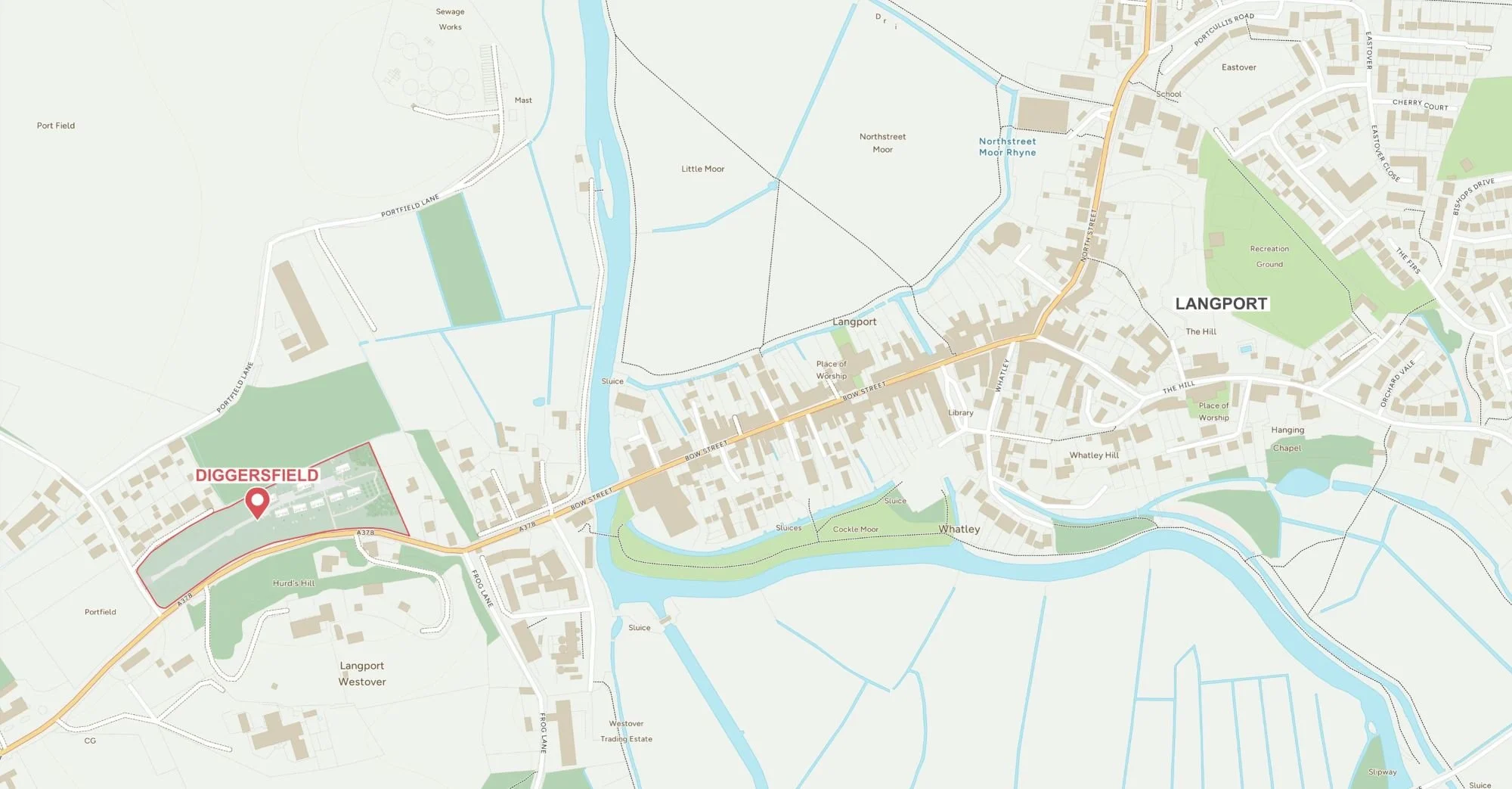 Diggersfield sits on the outskirts of Langport, a historic Somerset town. Connected by a footpath, and an easy walk over the bridge and into town, the site is peaceful, but well connected.